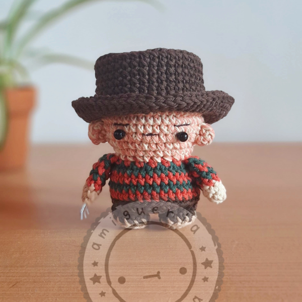 Archivo PDF con el paso a paso para que puedas tejer a crochet tu Freddy Krueger amiguero, más archivo para tejer a Mini Freddy ¡de regalo!.