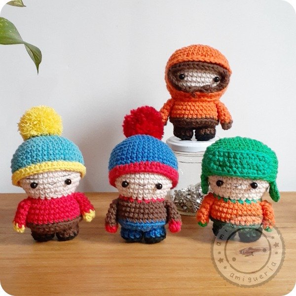 Archivo PDF con el paso a paso para que puedas tejer a los protagonistas de South Park: Eric Cartman, Stan Marsh, Kyle Broflovski y Kenny McCormick, y de yapa también podés tejer a Butters <3.